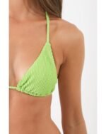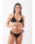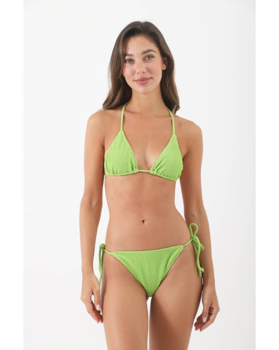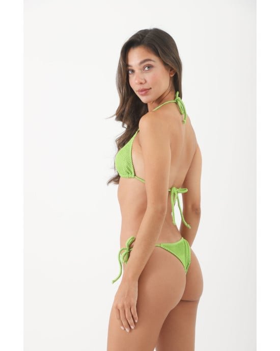 Bikini confeccionada con Lycra texturada. Triángulo básico movible y bombacha semiless para atar.