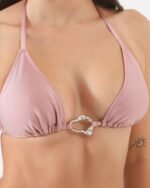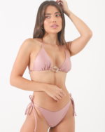 Bikini confeccionada con Lycra brillosa. Triangulo básico con avio en medio para atar y bombacha less para atar.