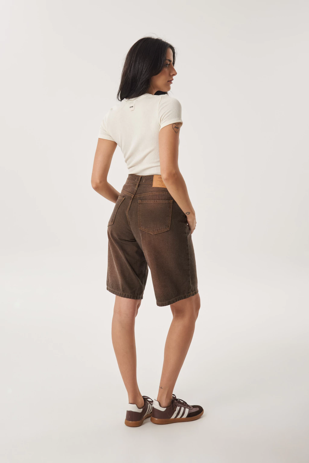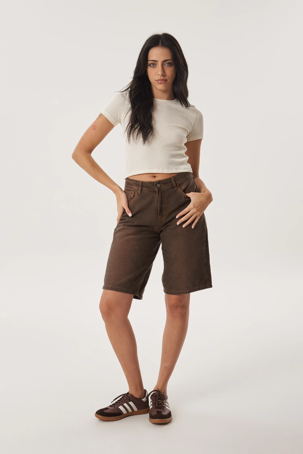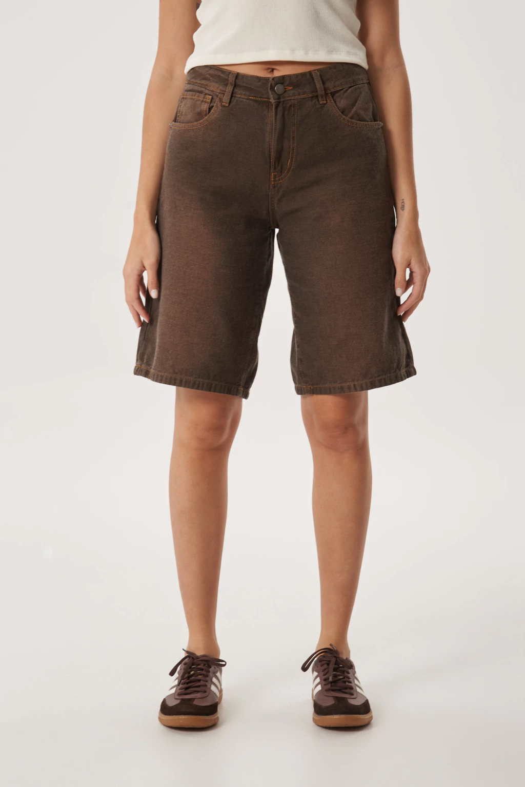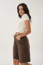 Bermuda de denim color marrón con efecto lavado y costuras a la vista. De tiro medio y calce relajado, combina comodidad y estilo en una prenda versátil. Su largo a la rodilla y tejido resistente la hacen ideal para looks urbanos o casuales. Perfecta para usar con remeras básicas, tops o camisas abiertas.