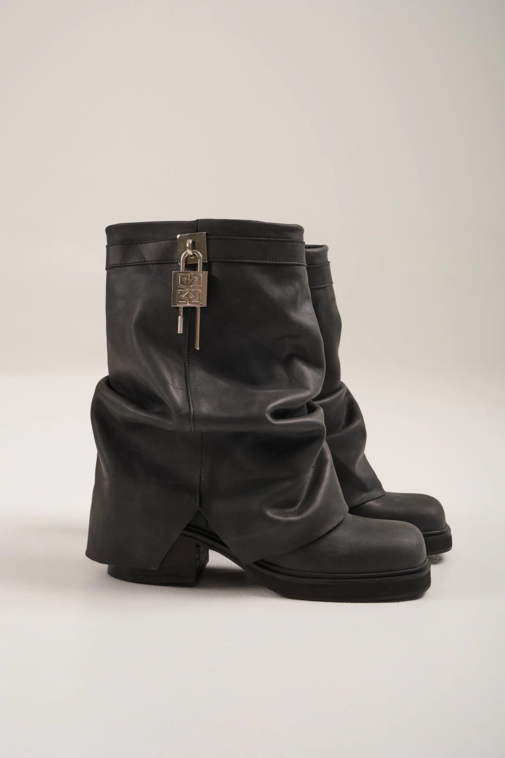 Bota biker boot fabricada en cuero. De diseño volcado con hebilla personalizada con el logo de la marca.