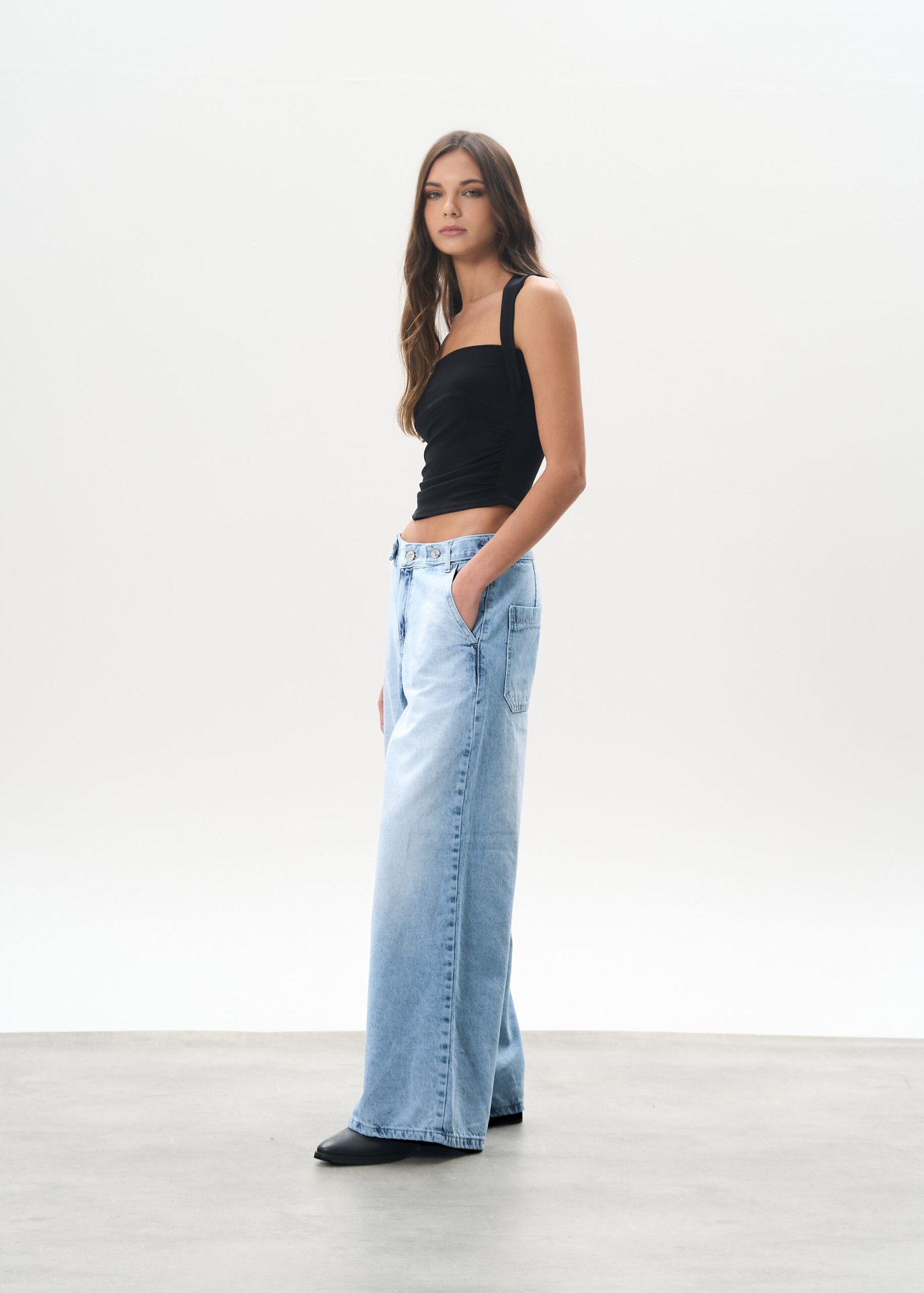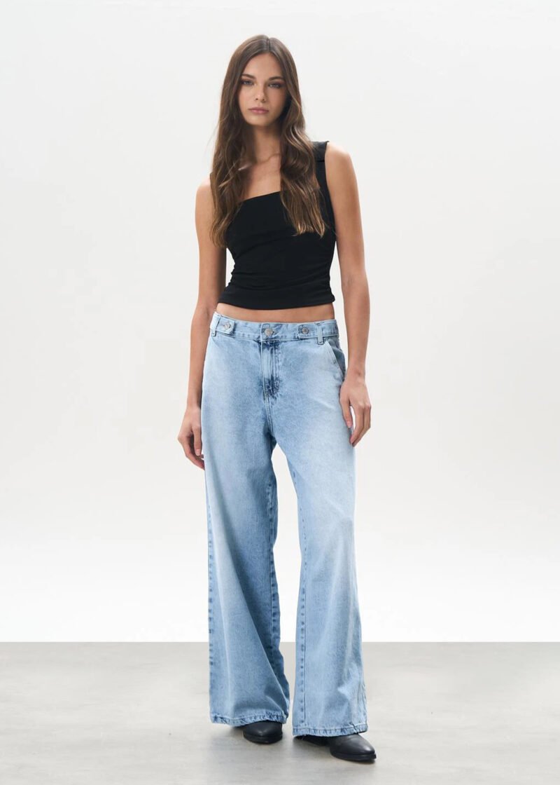 Jean wide leg con tres botones en la cintura.
